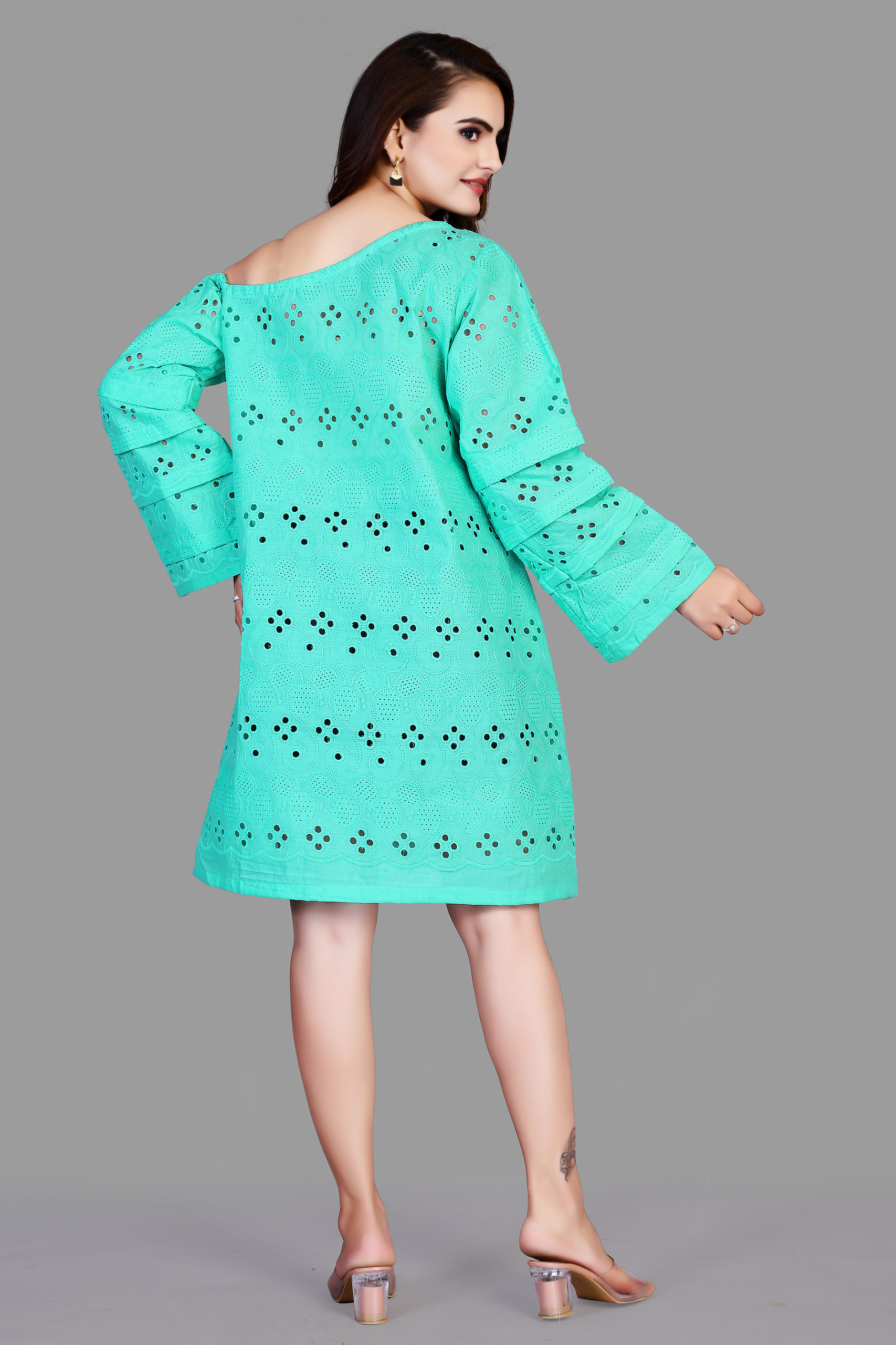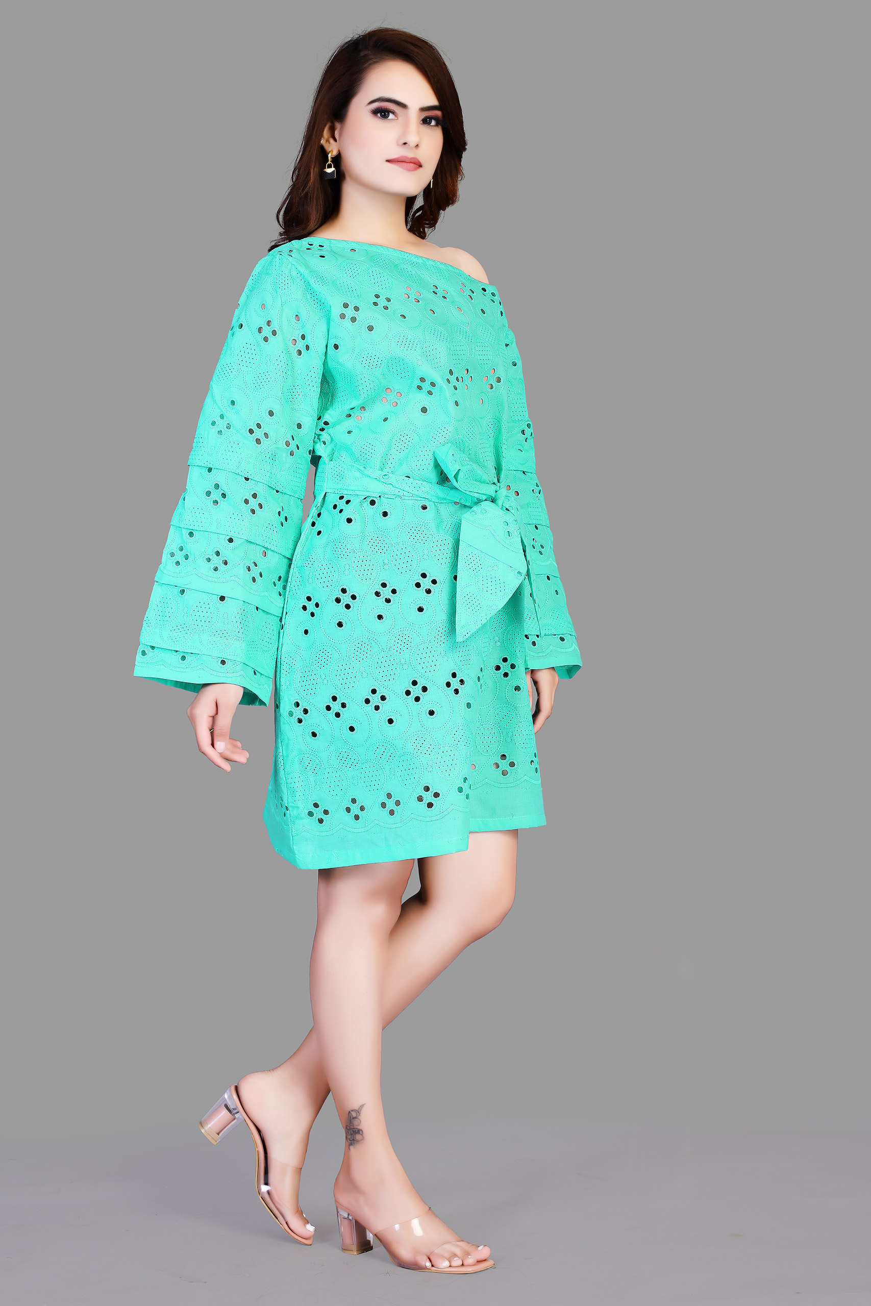 Its a Sea Green One Shoulder A-line one piece dress with beautiful knot at front that add more flaunt to dress. A line dress and trendy sleeves with belts fitting. One shoulder elastic fitting.